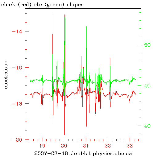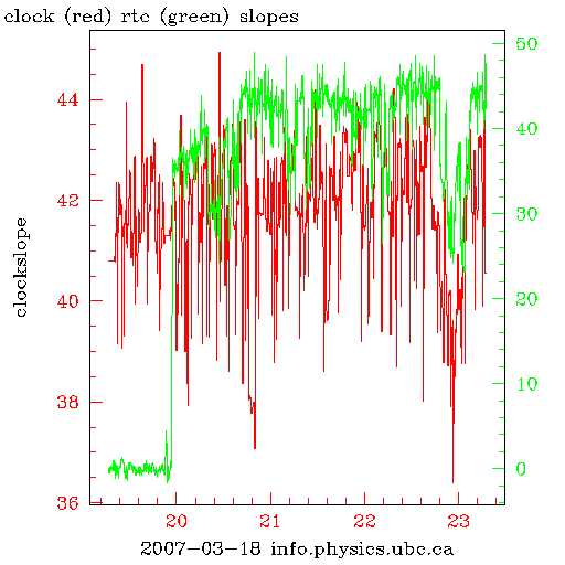 The following graphs show the fluctuations in the rates of the system clock and of the real time clocks on a variety of computers on the theory network. All synchronize against the same system, ntp.ubc.ca, a stratum 2 ntp server on campus ( the time delay is on the order of 100s of microseconds to that machine from any of these computers).