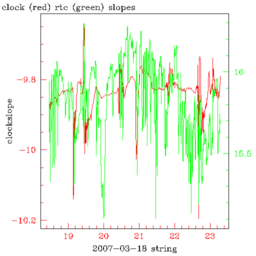 The following graphs plot the rate of the system clock vs the ntp server (red line and left hand scale) and the rate of the RTC vs the system clock(real time clock-- the CMOS clock)( dotted lines and right hand scale) against the time in days after 00:00 on the date shown. The rates are in units of microseconds per second. These rates are determined by comparing the reading on the system clock with the ntp determined times on the NTP server to adjust the rate of the system clock, and the rate of the RTC vs the system clock. Note that the strong correlation between the rate fluctuations suggests that the system clock is the primary source of noise, and that in general the RTC has better stability than does the system clock.