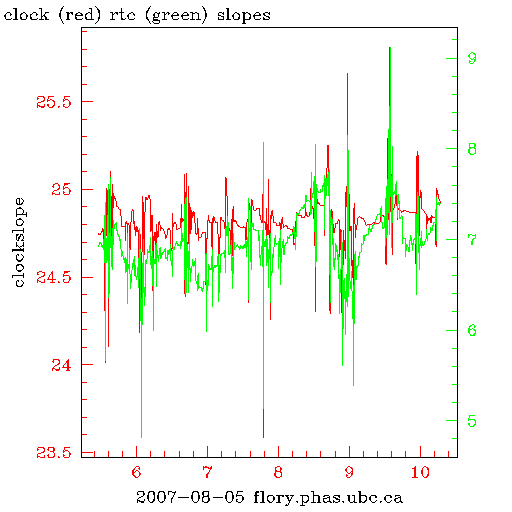 The following graphs plot the rate of the system clock vs the ntp server (red line and left hand scale) and the rate of the RTC vs the system clock(real time clock-- the CMOS clock)( dotted lines and right hand scale) against the time in days after 00:00 on the date shown. The rates are in units of microseconds per second. These rates are determined by comparing the reading on the system clock with the ntp determined times on the NTP server to adjust the rate of the system clock, and the rate of the RTC vs the system clock. Note that the strong correlation between the rate fluctuations suggests that the system clock is the primary source of noise, and that in general the RTC has better stability than does the system clock.
