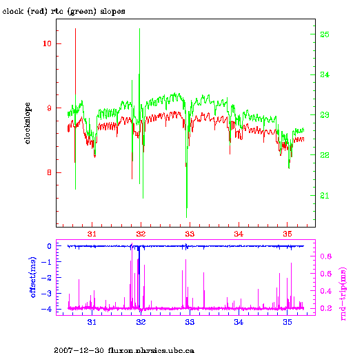 The following graphs show the fluctuations in the rates of the system clock and of the real time clocks on a variety of computers on the theory network. Until June all were synchronize against the same system, ntp.ubc.ca, a stratum 2 ntp server on campus ( the time delay is on the order of 100s of microseconds to that machine from any of these computers). as the top graph shows that server had a 3-4 msec sawtooth drift against GPS time. Thereafter, string was synchronized against tick.usask.ca, a stratum 1 server synchronized against GPS. In Sept, 2007, string was put onto ntp and sychronized against a stratum 0 GPS clock ( A Garmin 18LV GPS receiver with a PPS output) against which it maintains a roughly 2-3 microsecond offset. All of the other clocks are chrony synchronized against it. It is less a msec via switches away from all of the other clocks.