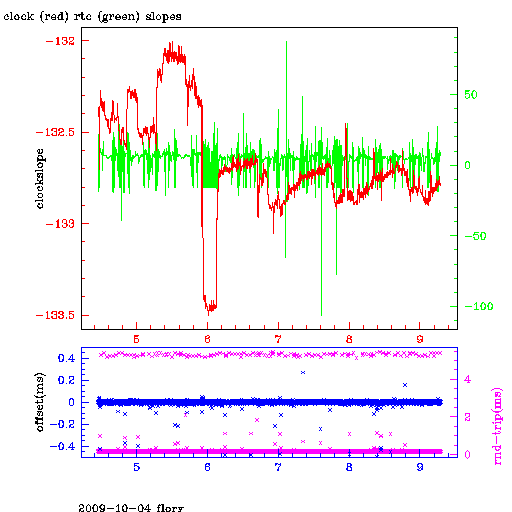 To investigate whether the oscillations with about a 1.5 hour period in most of the chrony graphs are real fluctuations (eg caused by temperature fluctuations with a 1.5 hr scale) or are produced by the clock algorithm of chrony itself, I placed flory onto ntp as the client instead on Jan 19 2007. What is striking is how long it took the ntp client to come into sync. In the graph below a plot of the offsets, the rate set by ntp on startup. NOte that there was no drift file, so ntp had to figure out what the drift rate of the clock was on its own. But the behaviour was such that the clock, which was within less than a ms of the correct ntp time before the change to ntp and running at the correct rate (having been set by chrony), ntp caused the clock to rapidly go to a -20ms offset overcorrect to a 60ms offset and then take hours to finally get the clock back to about +5ms. Overnight, it went to a poll number of 10 (2^10 sec) and the switch between flory and string seems to have occasionally introduced 5-10ms delays ( about 20% of the time). However, ntp over the next 8 hours never managed to get the offset below 3-6ms. At daynumber 19.815 I restarted ntp with maxpoll 7 ( which was the same as I had run chrony at) and the offset now rapidly settled down to about 100usec., and began to have both positive and negative excusions. Ie, ntp seems to have a really hard time dealing with transient effects (like being started without a drift file). Chrony on the other had even with a one second initial offset settles down to a locked, minimal offset conditions in less than an hour.