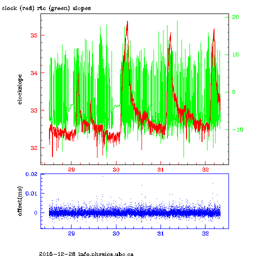 These two graphs represent the very different response of chrony and ntp to glitches in the drift rate of the clocks. I have no idea why the clocks suddenly have drift rate changes, changes which seem to effect both the system clock and the rtc but at very different magnitudes. In the case of chrony a 2PPM change in the rate, causes a 100-200usec change in the offset, but that disappears withing about 5 min and the clock settles down to its new rate. In the case of ntp, a 0.4 PPM change in the rate causes a 600usec change in the offset, and this offset takes a about 6 hours to disappear to settle back down to the pre glitch level. Now of course the detailed structure of the rate change is unknown since all we have is the offset and rate as reported by ntp. Thus, a glitch which is 1/5 as big produces about 5 times as big a change in the offset, and the time for this change to disappear is about 20 times as long.